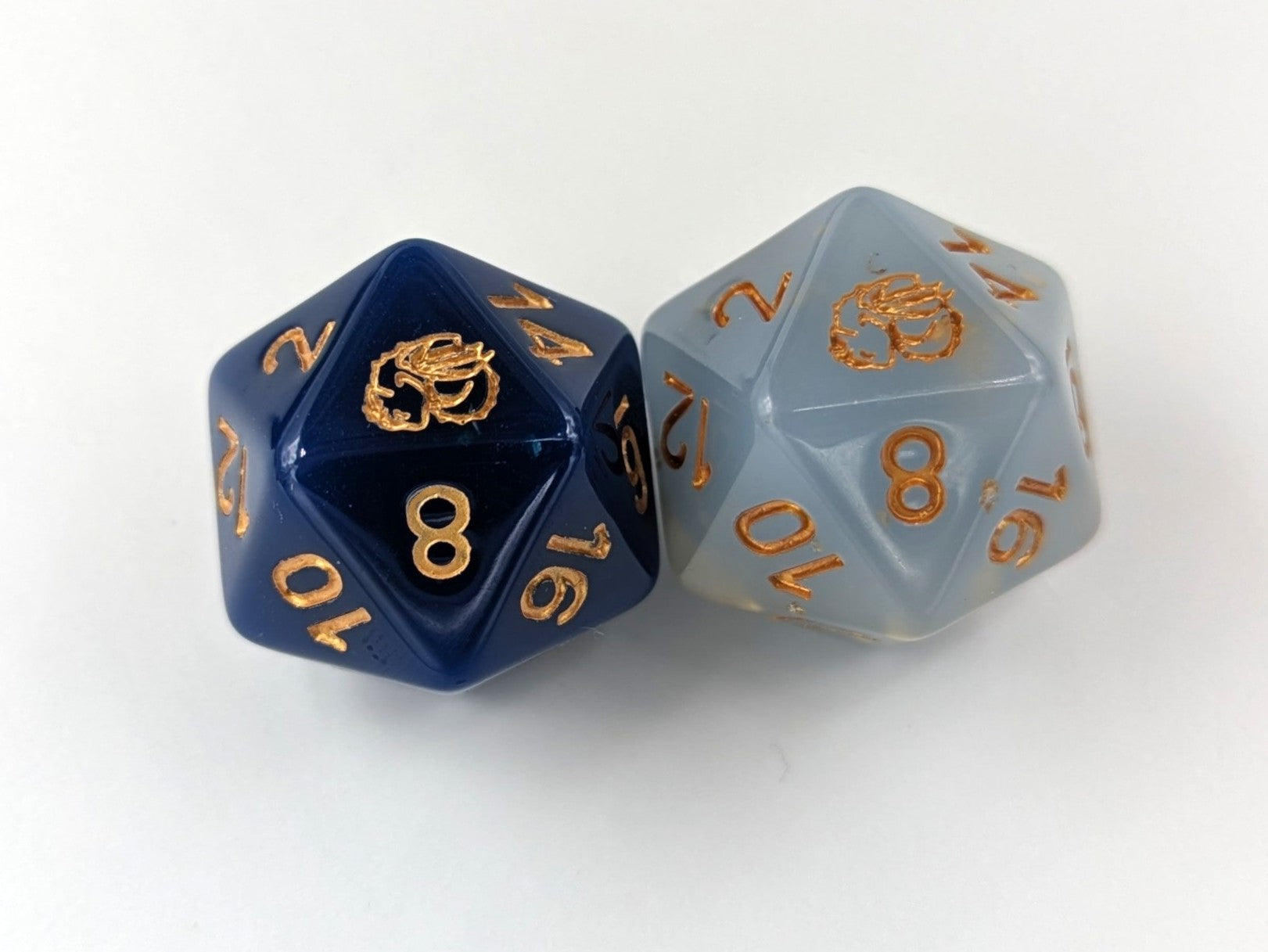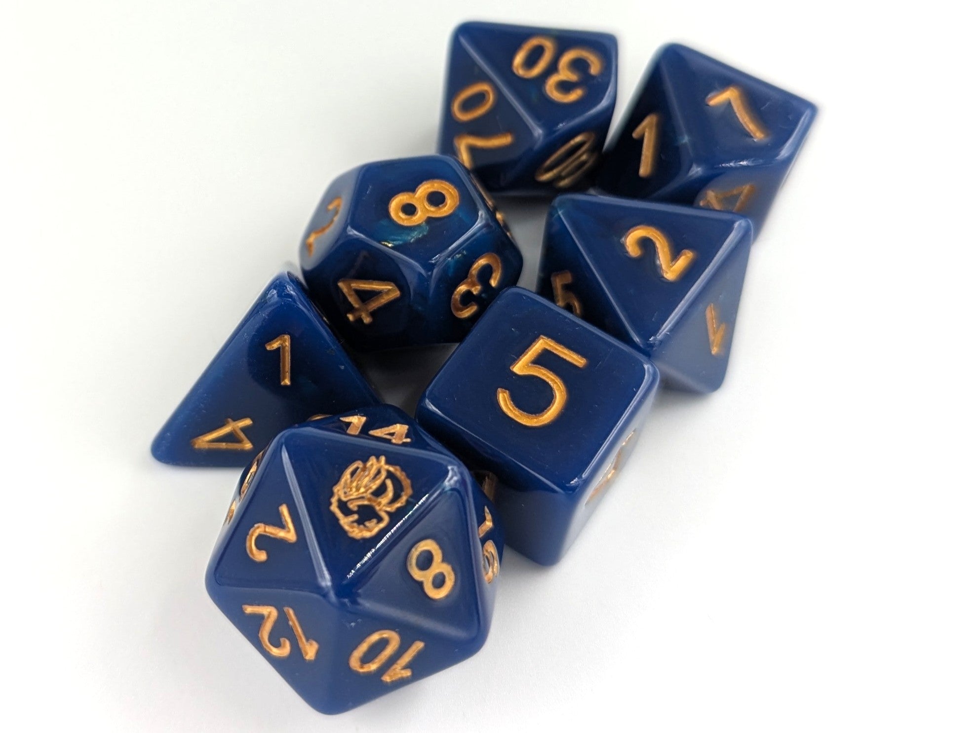 Dark blue to light blue heat color changing dice set with gold flake and gold ink