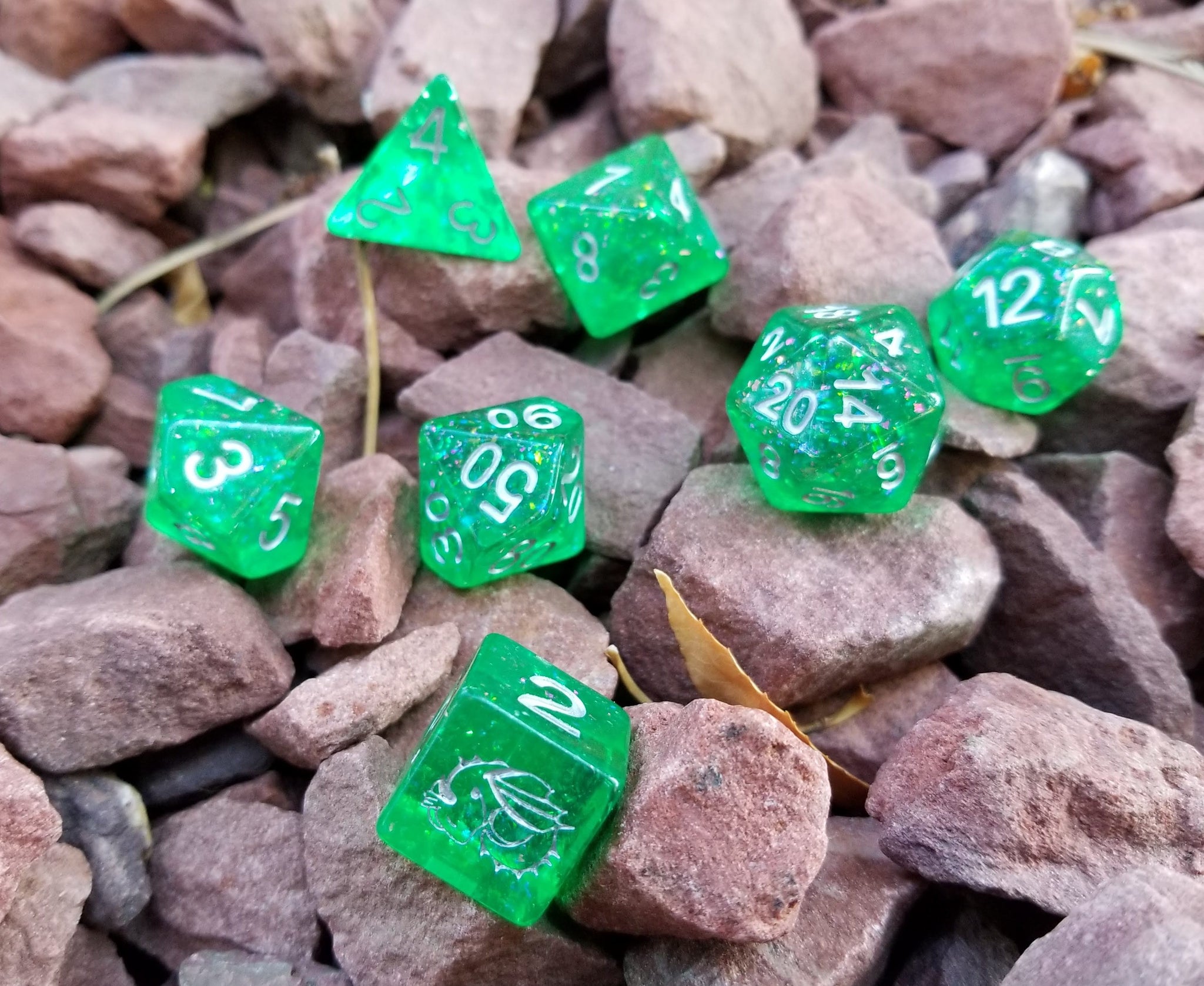 Vitreous, Green Glitter with Green Font with Talys Dragon. 7 Piece Standard Size Dice Set